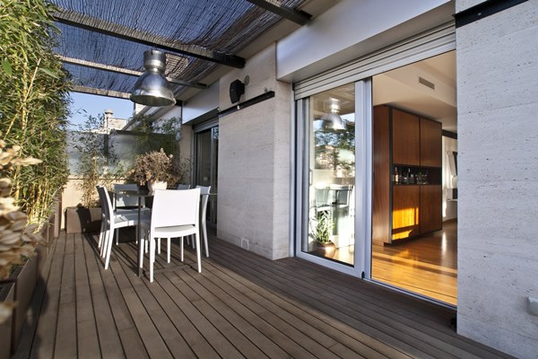 Los grandes ventanales conectan el interior con una acogedora terraza tratada como una estancia más, con tarima exterior, jardineras y cerramiento decorativo que aportan privacidad y carácter, además de una iluminación nocturna que cambia por completo la escena visual.